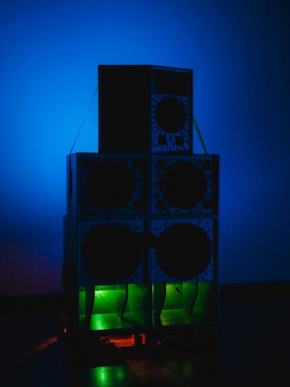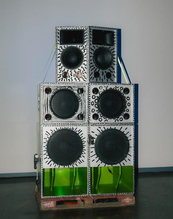 Custom built speaker by Simon Fuh. The Beginning x TPWParty with DJs fuhsta, Valeroo, and Ace Dillinger,August 17 2024, Gallery TPW (Toronto), Photo credit: Gloria Wong.