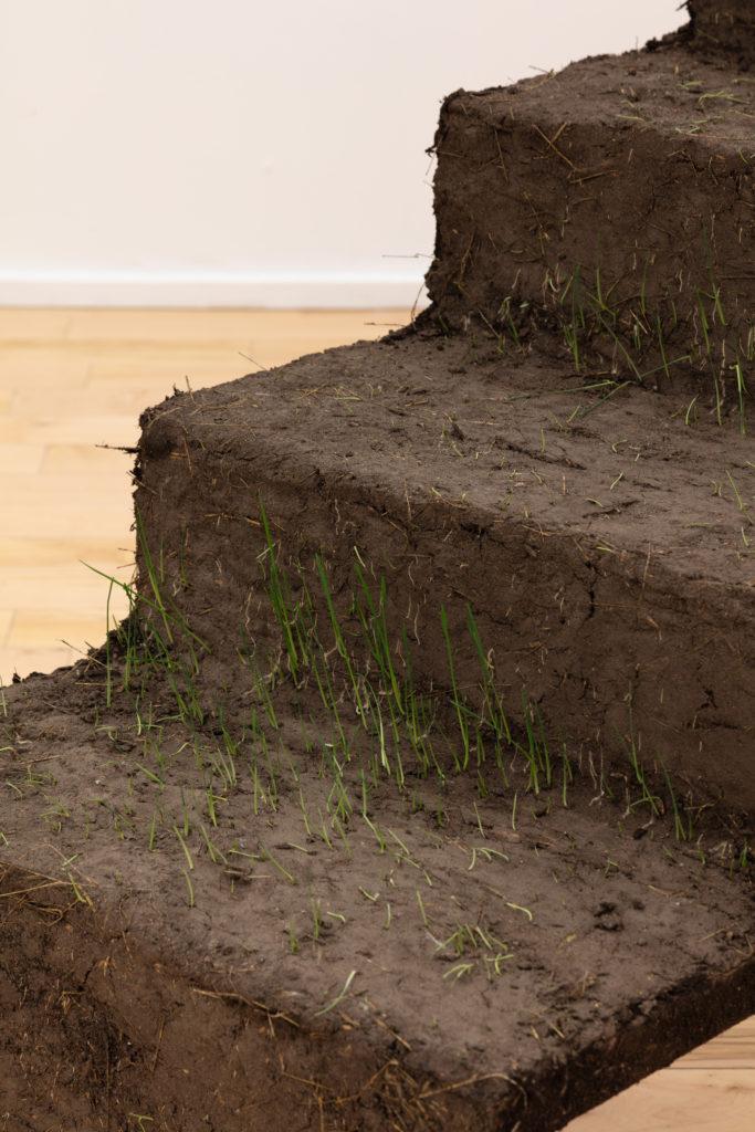 The presence of soil in contemporary art can be thought of as continuous with the Earth Art movement of the 1960s and 1970s. Iconic works of this era include Andy Goldsworthy’s stone cairns and cracked clay walls; Michael Heizer’s geologic fissure in the Nevada desert; Walter De Maria’s Earth Room sculptures, in which the artist scattered soil across gallery floors; and Robert Smithson’s mud and basalt jetty in Utah’s Great Salt Lake. What differentiates contemporary uses of soil from these material predecessors, however, is the more recent association of soil with climate change, colonization, and resource scarcity, emphasized by environmental catastrophe.