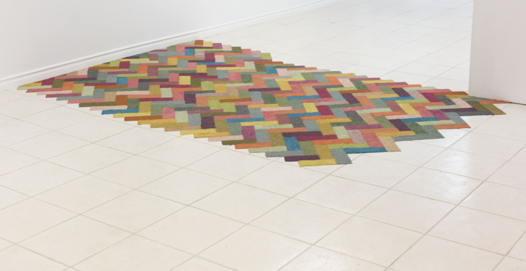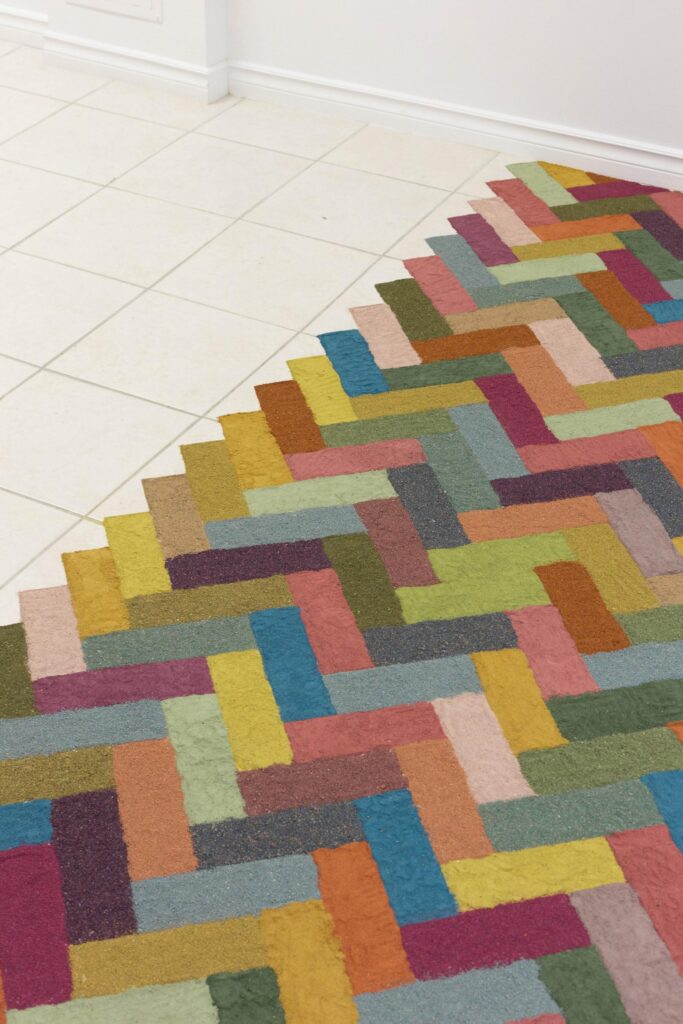 Toronto-based artist Shannon Garden-Smith considers these timescales through her use of sand. Concerned with the geopolitics of the material and its non-renewability, the artist creates installations that reflect the human-geological relationship with sand, and its use in the property development sector. In Sand Silhouette (2021) installed at the plumb, an artist-run-centre located in Toronto, Garden-Smith created a herringbone pattern out of coloured sand that viewers were invited to walk on throughout the course of the exhibition. As the weeks wore on, the herringbone pattern softened, colours blended and footprints left indexes of the viewers’ paths. The title Sand Silhouette, refers to a form of archaeological remains called a trace fossil, that captures the movement of bodies rather than the body itself. These fossils are often footprints or silhouettes that have compacted over time. Through the social element of her sand sculptures, Garden-Smith mimics how our bodies are indexed in the architectures we live in, our footprints trapped in cement after a fresh sidewalk pour, our fingertips swirling around in compressed dust. Her ephemeral sculptures reveal a geologic time scale through a poetics of indexes, pointing to the non-renewability of sand and soil alike.