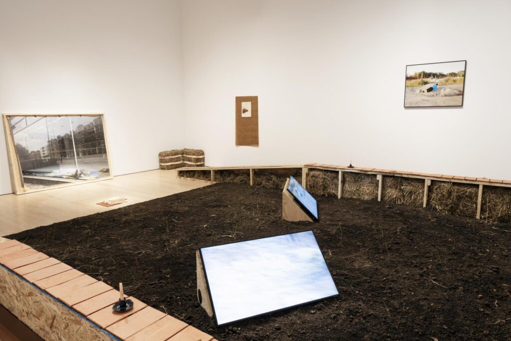 Since my encounter with Holly Ward’s work nearly a decade ago, I’ve noticed soil recur increasingly as a material in contemporary art. Through their practice, Montreal-based artist Eve Tagny considers the relationship between land and memory. Her practice employs performance, vernacular architectures, and organic materials to consider processes of land dispossession. Their recent exhibition Unadorned Landscapes (2023), features dark loam scattered across the gallery, contained within an open frame of plywood benches. The installation was recently displayed at the Musée National des Beaux-Arts du Québec, along with photographs, video, and multimedia sculptures. Throughout the gallery, bales of hay were sporadically placed, each wrapped in a ribbon printed with quotes such as: “the origin story of private property,” and “the land feels the loss of the people who lost their rights to the land.”2 These sentences are pulled from texts about land dispossession, from feudalism and the loss of the commons in the Middle Ages to the colonization of the Americas, plantation histories, and current processes of gentrification occurring in the Montreal neighbourhood where the artist grew up. The organic materials in the exhibition evoke an autumnal garden—hay ready to be forked, soil awaiting mulch. Simultaneously, they reflect the aftermath of real estate development: the untreated plywood and terracotta-coloured tiles are reminiscent of pallets and bricks. Through these materials, Tagny combines elements of both the utopic garden and the dystopic property sector, drawing out a critique of private property and land development as strategies of capitalism and colonialism.