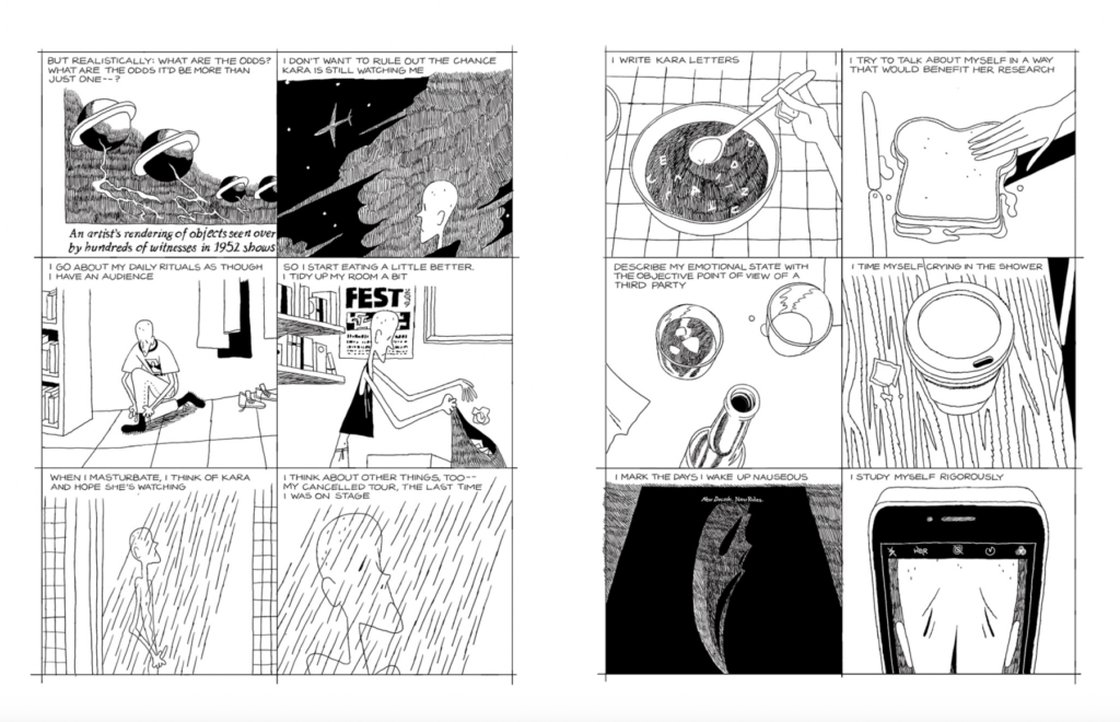 It came from a different place—it’s not really something I considered, but it makes sense especially because so much of the comic is about belief and doubt and disbelief, which is also one of the things I find inherently interesting about abduction stories. I’ve talked about this in relation to this comic, but a lot of it is me trying to find a different angle to write about my own experience with mental illness and institutionalization and the way people reacted to my response to struggles with mental illness, or however you want to phrase it. Like, how I relate to other people who have gone through similar experiences, whether that’s useful or not, whether it can be the basis of actual community or solidarity or whether it’s too tenuous. It’s something that I was trying to think through when working on it. Some of the relationships between Jackie and the group are based on how I relate to certain people in my own life. Those are unresolved questions for me still.
