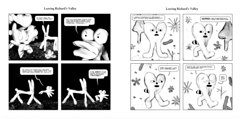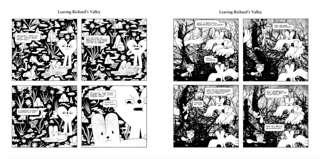It’s a subject I return to a lot. Partly, it’s that most of my adult life I’ve lived in Toronto, at this point twenty-plus years. I’m also interested generally in trying to write about community. How spontaneous versus how intentional does a community have to be, especially under capitalism, in order to sustain itself? I think, with Leaving Richard’s Valley, a lot of it was me directly working that out. It’s very much a Toronto comic and references real and imagined Toronto history—very specific types of histories that would appeal to a nerd of my demographic. Like jokes about Rochdale College, which is pretty well-mined territory. But I also assume people could see other types of North American cities in it.