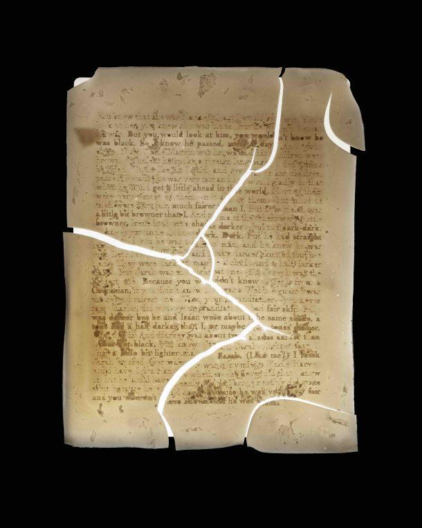Yes! I did get a lot of questioning looks from some of the more traditional ceramics artists along the way, but I’m deeply indebted to the artists who helped me hone the process, including Jeff Forster at the Glassell Studio School in Houston. This inquiry began as an idea that I just couldn’t get out of my head–I wanted to create porcelain documents. As I did test after test, I would adapt to what the material was telling me. It was a years-long process of adjustments and variables until I finally got the results I wanted. Even now it is an extremely fickle process, though, and I think that’s part of the work. Like with burying the film, I only have control over the process to a certain extent. The kiln makes a lot of artistic decisions for me. But one of the reasons I was so hooked on using porcelain in the first series, Cameo Ground (Children of Paradise) (2018) was because of its connotations as a “precious” material that is often passed down among generations. It’s also known for its whiteness and its fragility, though molecularly it is actually very strong (which is why it can get so thin). I also was intrigued by its history as a material that was “copied” by Europeans in an attempt to approximate (often unsuccessfully) the East Asian original. There are a lot of debates about what constitutes authentic porcelain. For Cameo Ground (Children of Paradise), I was really drawn to the way the material process caused the text to move in and out of legibility, with limited control by me. That piece includes thirteen paper-thin porcelain panels that include text from an interview that I did with my great-aunt Jane, the youngest child of Paradise. Jane talks about who among her twelve siblings could pass as white, and sort of categorizes everyone in relation to their skin tone–this person was two shades darker than this person, who was half a shade lighter than this person, etc. The text is the exact same across the thirteen panels, but different parts of the text are legible across different panels. I was thinking about the way the text moves in and out of legibility in relation to the way the passing subject moves in and out of social legibility–that a person might be “read” in one way in certain settings, and in another way in other settings. I also wanted the viewer to have to engage in the practice of reading across difference in order to be able to access the entire text. The next time I used porcelain was in For the Mud Holds What History Refuses (Providence II) (2019), a project that examines the complex social and natural histories of Providence Canyon in Western Georgia. Known as one of Georgia’s “Seven Natural Wonders,” Providence Canyon formed in under one hundred years as a result of soil erosion from over-farming cotton, which is like the blink of an eye in geological terms. In the early 1900s as part of an attempt to bring tourism to the South, the very human history of the landscape was obscured in favor of the narrative of a God-given natural wonder. But, Thomas Jefferson Flanagan, an African American poet and local to the Providence Canyon area, had a much more ambivalent view of the place and expresses it in his 1940 epic poem The Canyons at Providence (The Lay of The Clay Minstrel). Providence Canyon is visually very striking because of the juxtaposition between the deep red clay and bright white deposits of kaolin, which is one of the main components of porcelain. So, I created sheets of porcelain containing the text of Flanagan’s poem, and displayed them on a light box covered in red soil I harvested from my family’s former plantation land. Because legibility was less of a conceptual element in this work, I made the porcelain pages in a slightly different way which did not produce cracks and fissures in the same way as the process I used for Cameo Ground. In In case of some designing persons (2022), I used the same process as in Cameo Ground, but on a larger scale. In this case, I leaned on the topographic qualities that the process creates. The river-like gaps and fissures that occur when the cotton paper burns away during the firing process are reminiscent of maps. In case of some designing persons uses text from interviews with different family members describing experiences negotiating the “color line,” along with the field notes from the original land surveys of the plantation land, overlaid onto the gridded plat maps of the land parcels that were passed down from my great-great grandfather to my great grandfather. The porcelain warps and twists during the firing process, skewing the grid and forming a new map.