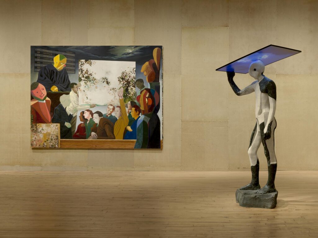 All three sculptural figures carry a flat-screen TV playing video works you produced in collaboration with Thomas and Anna Eisenman, your nephew and niece. Unlike the paintings, the videos depict some pretty abstract stuff, like hurtling through space. What was this collaboration like? Do you think of the videos in terms of abstraction?