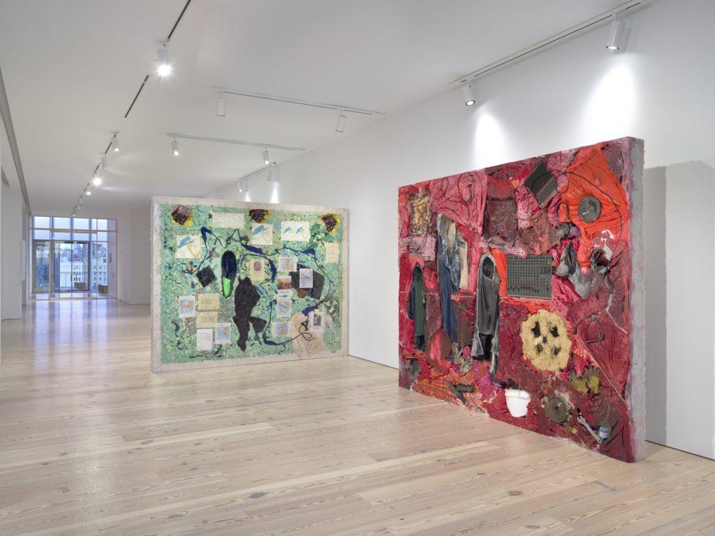 Three colossal rectangular slabs composed of atomized, piecemeal materials—alluring, grotesque, beguiling to the senses—were fastened together, coated in a sheen of plastic resin. Within their resin substrate, all three sculptures shared a common base material of raw cotton, sourced from a farm in Lynchburg, West Virginia, where Beasley’s family has resided for generations. Each structure’s “content” reflects different facets of the cotton’s fraught historical resonance, functioning as a sort of triptych. In the first slab, The Reunion (2018), Beasley collages soil, sticks, and other organic materials with patterned textiles and brightly-dyed swaths of cotton to assemble a pleasant, pastoral image of a country field, layered with thick underbrush, rising flowers, and a sunny sky. Campus (2018), the second slab, is double-sided, one face evoking a cartographic arrangement of farmland and lakes through green and blue dyed cotton rectangles, the other setting a mind map-like array of garments, book pages, and archival documents from Yale University (where Beasley did his MFA) balefully punctuated by several racialized jester masks, all set against a yellow-green backdrop. The objects hover queasily against the structure’s uncertain material solidity; the aspic’s suspended-animation format acts like an engineer’s “exploded view,” as Beasley takes stock of Yale’s institutional involvement in the US slave trade, and in anti-Black exploitation’s foothold in the highest rungs of material power. The third sculpture, The Acquisition (2018), is dyed in visceral hues of deep red and purple, its cotton base scattered with workers’ garments, a Yale hoodie, gloves, tools, earmuffs, a gas mask, and sound mixers. Here Beasley brings together the autobiographical threads running throughout the show, as these objects recall the gear he uses in his own artistic labour while at the same time signalling the working tools of countless invisibilized, racialized, and exploited labourers across the world, past and present.