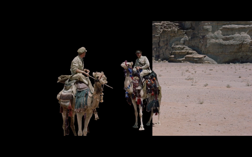 The aggressive editing style is about two things. It’s about me being transparent about manipulating the film, or the author telling you that I’m here. It refers to the work as a work. I’m interested in the idea that the work I’m showing is referring to the form and referring to the screen itself, or to the process itself. The work announces it is about filmmaking, but this is also a film. I’m not trying to suspend anyone’s disbelief. On the contrary I’m pointing you to the form to say there is an author and a point of view to this. This form is not neutral. It doesn’t just exist. I think this is a problem with some fiction film that hides its own artifice. Aggressive edits become a way to declare myself as the author and declare the form of the film. There are different manipulations – the cutouts, recording the screen, pixelation, etc. – to remove the polish of the image and its bigness. People often remark on the beautiful scenery in Lawrence of Arabia – it’s epic and big, and huge, and it is all those things. It’s also just beautifully shot. A lot of it is shot on location in Wadi Rum, in Jordan. For me, because I was born and raised in Jordan, and visited Wadi Rum repeatedly, it was interesting to see how it was filmed, and how the technical challenges of doing that were met. The cutouts almost became a way of removing that scenery. I wanted to focus on the characters and take a critical distance from the attraction of the film.