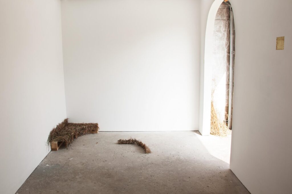 I think sometimes it’s a balancing act, and sometimes it’s about surprising myself too. I’m thinking about Alyssa Alikpala’s show in late 2023, for example. Her work is installation using a lot of found organic materials, and it’s very ephemeral. Her project was oriented around a residency that she did in the laneway. She was using all these different plants, mostly grasses and goldenrod from the laneway, building up architectural casts using a homemade glue that ended up becoming sculptures. They became quite a literal representation of the gallery space. Alyssa was also taking some new risks in her practice with this show, infusing her installation practice with her background in fashion design. I remember feeling so inspired and honoured by her bravery and it made me want to try something out of my comfort zone, too. For the text for her show, I wrote a short story that was told from the perspective of two birds watching Alyssa do that work of gathering, coming in and out of the garage. A lot of the conversations I was having with Alyssa at the time were about the laneway as a character, and its vitality. This marked a rupture in the tradition of texts I had been writing for Joys. It was inconsistent and vulnerable, but it kind of balanced out how directly Alyssa was confronting the space and her own history. She was creating a really beautiful imprint of the space at that time, incorporating the resilient plants that sprang up from the concrete right outside. I felt there was more room for a little fiction to come in, and for that fiction to enhance some of the themes, allowing different points of view to come to their own conclusions.