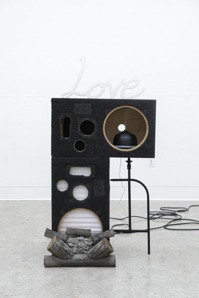 Love, 2021, fake campfire, blinds, speaker cabinets, essential oil diffuser, floor vent, wooden sign, extension cord, iron fence