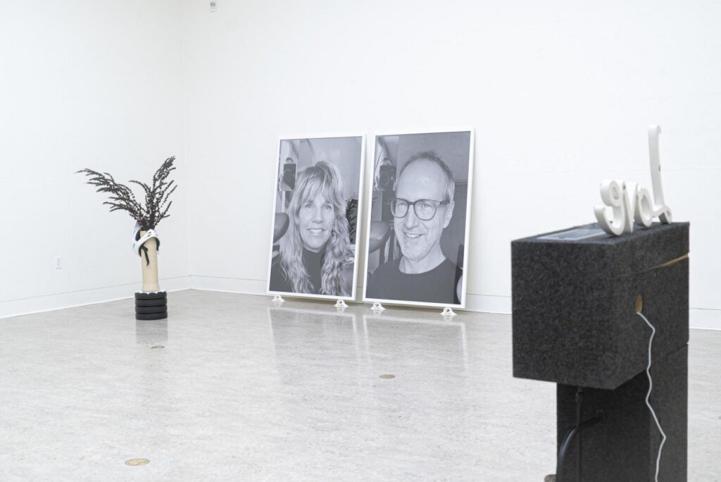 A personal favourite and centerpiece of this oeuvre is one that hovers and gives the space a reflective ambience. To harken back to a site of tragedy, Wiebe re-imagines a fragment of his former studio from Winnipeg, the one taken by the fire. The minimalist installation Flies includes dead flies in the light fixtures of the gallery just as appeared in his previous workspace. It is a lyrical palimpsest to the impermanence of life, its fragility, and what we do with that very knowledge. In a more physically corporal piece, the knowledge of impending death is confronted in the form of premature obituary photos. The artist’s very alive parents who like their son, wade through the same dark humour, asked Wiebe to capture their likeness ahead of their future funeral ceremonies.  The towering image pair—Mom and Dad—was taken virtually during the height of the pandemic lockdowns. They rest atop a 3-D printed finger heart gesture like the one Taylor Swift would’ve made ten years ago. In an interview conducted back in 2011, the singer explained why her fans credited her for initiating the heart symbol. She commented, “It just means something between ‘I love you’ and ‘thank you’…A sweet, simple message that you can deliver without saying a word.” Whether winking at a decade-old fad or questioning its half-felt pleasantry, Wiebe continuously tiptoes between sincerity and his trademark head-scratching lampooning.