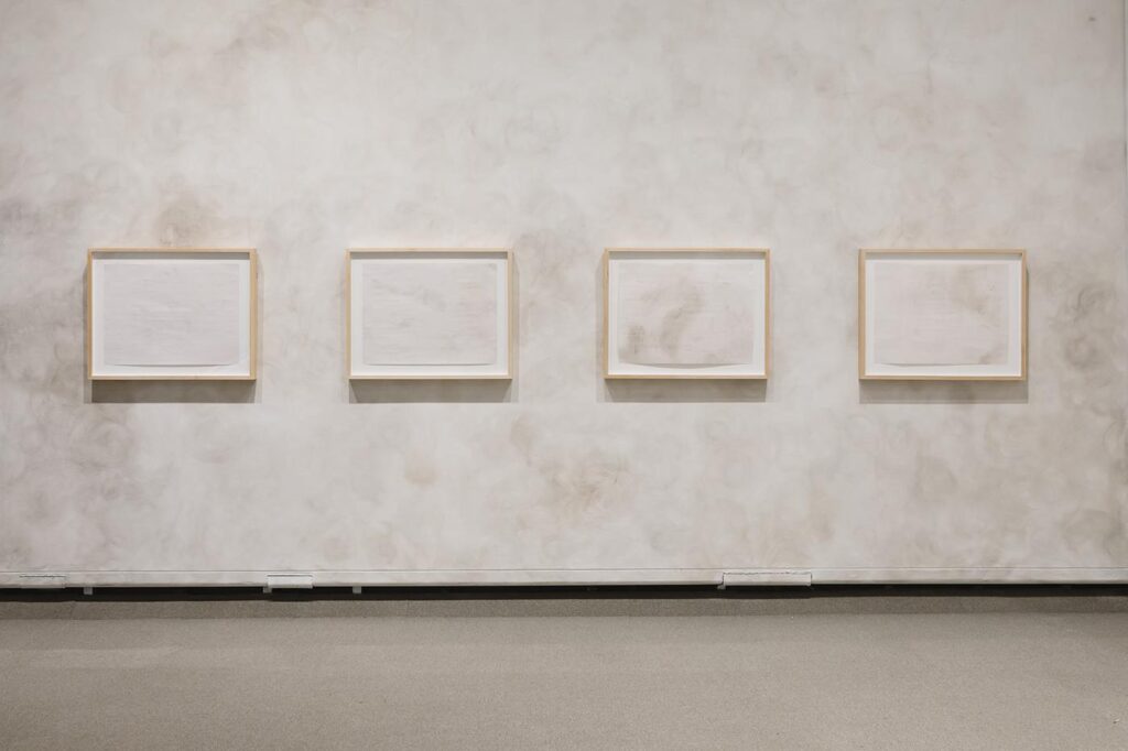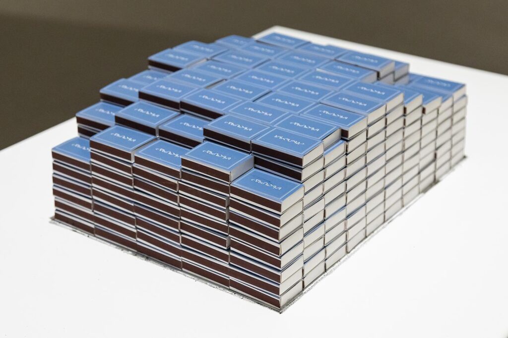After Murray has finished a section, we stand back and look at the warm grey field “It really looks like smoke” she says. We talk about the spectrum between presence and representation in the work—how it is both a representation of burning and a record of its aftermath. In the burning, smoke peels away from the ash like petals fall from flowers or limescale collect in the kettle. Each of these small things is a record of time and devotion, no matter how mundane it may be. Each match struck is a message and every spark is a signal.