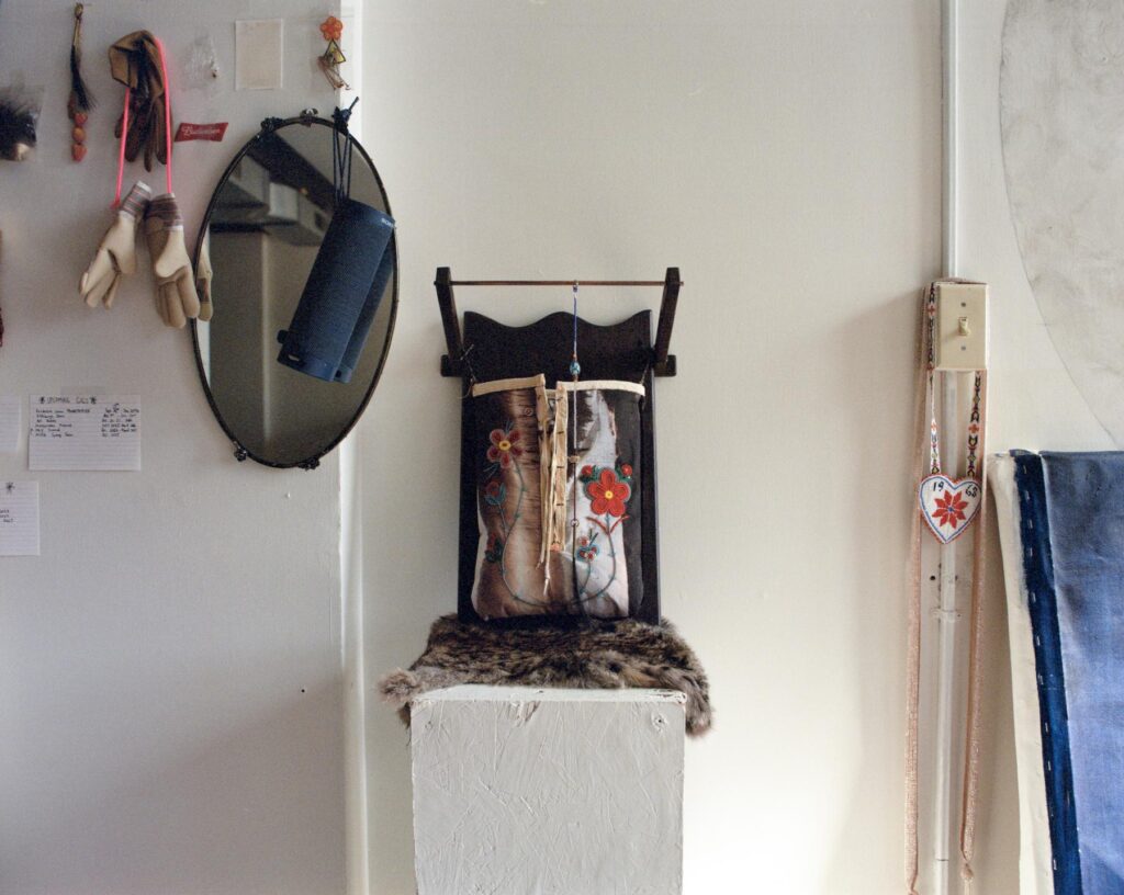 Among the veins of connectivity that run throughout Murray’s practice, there is also a consistent thread of distance, withholding, and obfuscation. Having drawn from personal relationships in my own art practice, I can identify with this inclination. Murray has made work in relation to her mother, brother, mooshoom, and son, as well as hammerstones and ancestral pieces of beadwork. Some of these works engage her relationship to ancestral objects at a distance, for instance through photographs like in the 2021 piece ‘chi fii embraces the old ones.’ In this piece Murray made a beaded daisy chain that she wrapped into the groove of a hammerstone, the work was then presented as large-scale photo-banners. She has told me about the discomfort she would feel placing these actual objects in systems of display that have been used to “other” Indigenous people and present them as specimens. The actual objects remain with her while the gesture is presented to the public through the distance of a photograph.