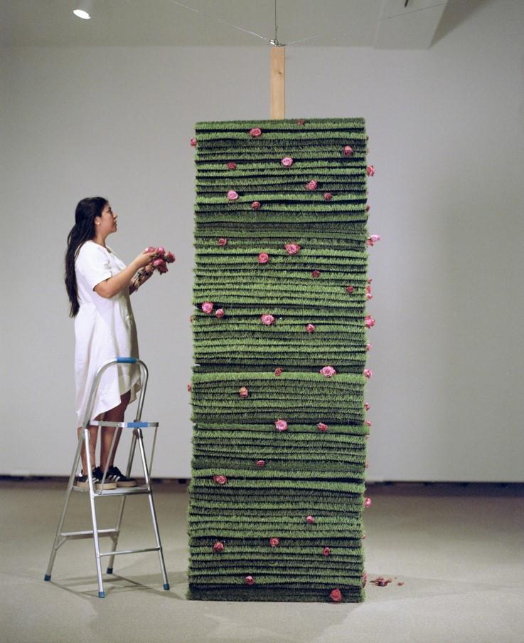 Many of these political questions are present in To Make Smoke but none are more insistent than “Rootless” (2024). The piece is a monumental square column of astroturf sheets stacked and studded with pink roses which have been slid between the layers. One might expect the contrast in the piece to be between real roses and fake astroturf where one is cast as authentic and the other as an imposter but the twist Murry makes on such a simple dichotomy is the deployment of the rose as a product of capitalist intervention. Throughout the run of the exhibition, the roses wilt and dry, unable to get sustenance from the astroturf or the hermetic environment of the gallery. Periodically, they are replaced with more pink roses driven straight from Costco. From certain vantage points, the piece touches on ideas about imposters and imitation but it also engages questions about time and connection. Murray’s practice is sustained and nourished by relations that stretch across generations; they are lived connections that have taken time and attention to cultivate and maintain. Along with her commentary on imposters, she has created a counter-monument of sorts to the connectivity that she fosters and, in turn, nourishes her.