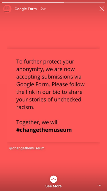 Sharing one’s story even through an anonymous or tagged submission is not without risk and backlash. As the presence of ChangetheMuseum has grown, a methodology for submissions through a Google form has been realized which outlines the framework used to ensure that stories are vetted, consent is given, and the aftereffects are considered.