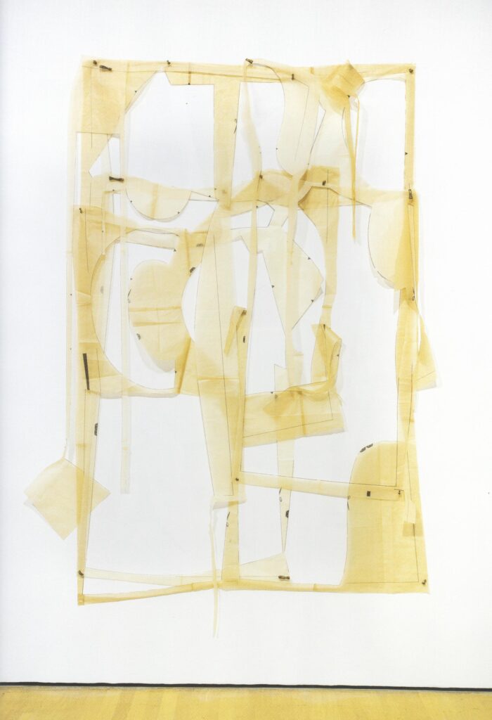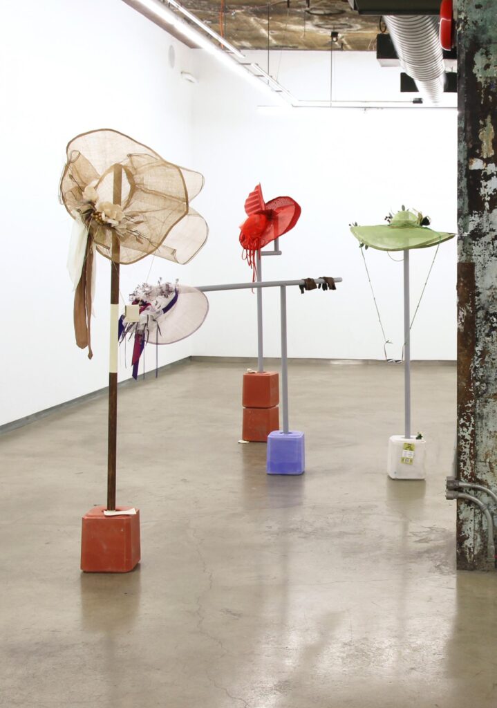 Drawing on fashion, sports, and industry, Kraven’s exhibitions delicately undo and recreate mutable impressions of bodies, highlighting their absence and instability. In Razzle Dazzle Sis Boom Bah (2014) a series of fanciful hats fit for the royal pate of Queen Elizabeth II herself rest jauntily on hat stands made of salt licks (the type strewn across pastures for grazing animals, large colourful blocks) and metal pipe. Dust Against Dust’s (2019) fabric sculptures gesture towards garments, and are rendered precisely in jewel-toned taffetas with carefully hemmed edges. Other exhibitions feature nets draped haphazardly and rough denim fraying, textile compositions that maintain a jagged harmony, falling just shy of cacophony. This work is not prescriptive, rather it is open, literally coming apart at the seams.