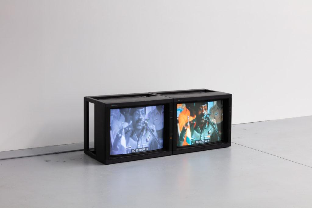 On the opposite side of the gallery, another sculptural monitor is perched. It’s a twin-screen displaying the same footage, but with different colouration. It shows what looks like an official press conference with a lieutenant general announcing a change of Ghana’s switch from driving in the left lane to the right. This is likely the most seemingly innocuous and disjunctive of the pieces gathered in the exhibition. With little information on the piece itself in the installation, and being of Ghanian parentage myself, I became especially curious and so, I sought out more. The video is from 1974; my mother would have been barely 10 years old in Accra, so she had no recollection of what the video recalls. My grandmother, however, did recall when this change was happening; the public service messaging on the radio and on the news was cautioning drivers and motorists. There were even catchy jingles in ads as earworms for drivers. Beyond the improvement of road safety and smoother trade with its neighbouring countries, for Ghana, this moment was a small but significant shift away from the ways of the British, whose colonial rule in the country officially ended less than 20 years prior.