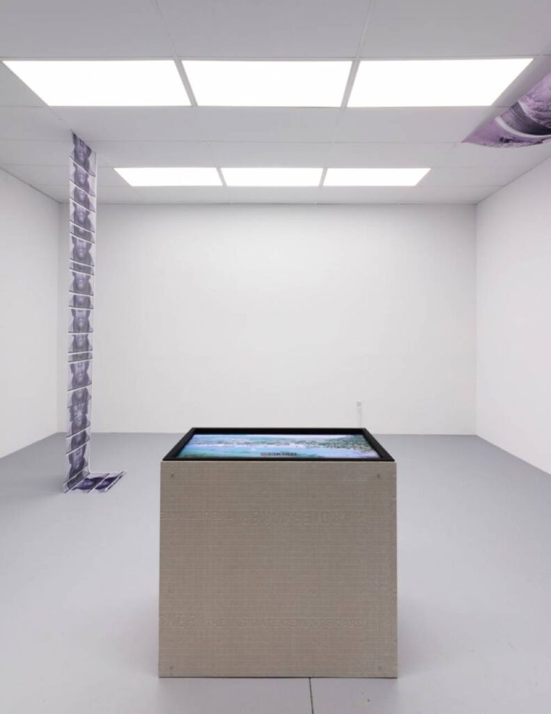 In Hunter’s exhibition, Volcanic Spine, like the ones that came before, he takes his predilection for drawing our attention to archival encounters and further immortalizes them through spatially arranged corporeal gestures. After sourcing anthropological images captured days after the eruption, he re-presents them through translucent fabric prints, and swathes them sculpturally for the installation. This is mingled with another strip of translucent fabric work (Untitled Loop 1, 2021) that cascades down from the ceiling of the gallery, folding onto itself on the ground. It depicts what looks like looping film footage of a man whose face is never fully revealed in any of the film frames. In between these fabric photographs is an upright rectangular prism made of concrete cement board, with a TV monitor embedded atop (Pelée’s Tower, 2021). The eminence of poet Kamau Brathwaite’s solemn words reverberates over a muffled beat that plays ambiently alongside the video montages from the monitor.