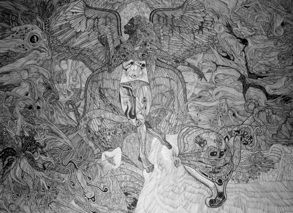 I also see in this idea of duality and tension — in the ways that you’re describing your performances and your music – as a connection between your drawings and your music. Somehow, I feel like your drawings are doing similar things. There’s so much going on in your drawings – you look at the whole picture and there’s so much happening – but then you zoom in and can see each intricate detail.