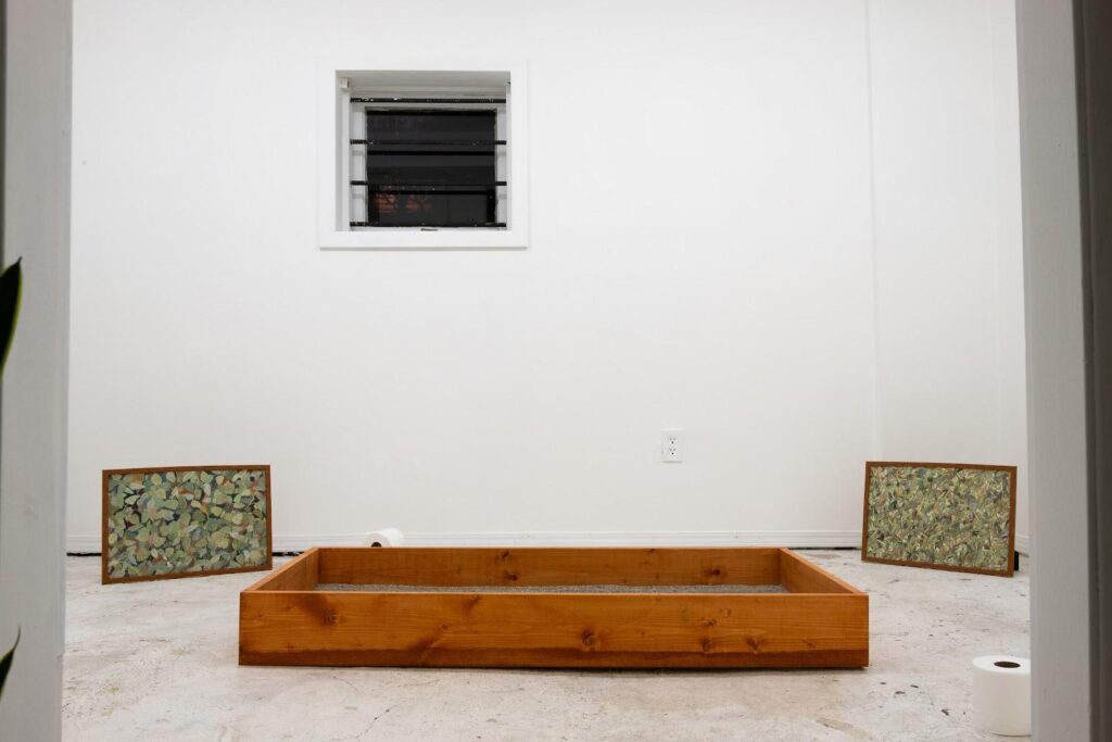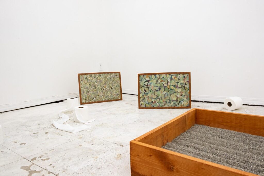 2. The exhibition is titled “Morning Sun Garden” and is the Canadian solo debut of Thai artist, Aracha Cholitgul, a close friend of Qian. Upon entering the exhibition space, a white room with concrete floors, it’s the large litter box which acts as a centerpiece that is the first point of focus. It is raked neatly, with little paw prints of a past feline visitor. There are small patches of urine deposits in the box. Rolls of toilet paper are placed intentionally around the room, some of the rolls slightly unraveled, as if to cheekily suggest that a human may have participated in the toilet ritual among cat companions. Or perhaps some playful paws batted about the rolls post-washroom visit. I find myself squatting down low, as if to assume a cat-like vantage point of the space. A familiar humming yet momentarily sharp smell of cat urine hits me. My human senses can’t tell if the smell is an invitation or an aversion.