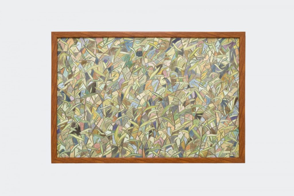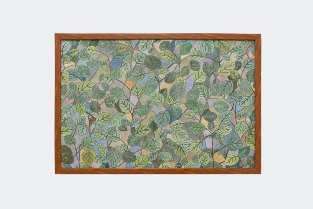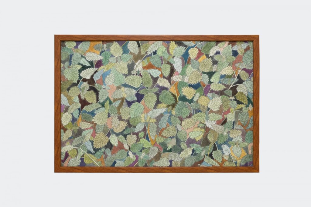 3. Delicate color pencil drawings of different plants surround the litter box. The drawings act as a pleasant scenery, with cats in mind; Indian Mercury, Catnip, and Bamboo are the plants depicted and are known to be liked by cats. I stand up from my squat and move over to the Bamboo depictions, finding myself squatting again. It seems to be the easiest way to experience the exhibition; low down. The bamboo is thick and dense. I wonder how many, if any, cats have sniffed this painting, to confirm it as an emulation. I don’t sniff it; perhaps I should have.