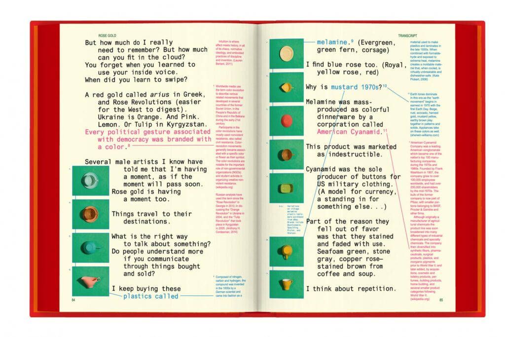 As in the performance, Cwynar’s book Glass Life visualizes the process of collecting and consuming images and objects. Alongside essays by writer and curator Legacy Russell and writer Sheila Heti, the book includes annotated transcripts, photographs, and stills from Cwynar’s trilogy of films: Soft Film, Rose Gold, and Red Film. The book includes the research behind these dense and meticulous works, walking the reader through the material histories that each film takes as its subject. Soft Film, for example, begins with a velveteen jewelry box, and Rose Gold with the sheen of an iPhone in the titular hue. Serena Chen’s book design mimics Cwynar’s recursive practices of collection and citation. The usual superscript footnotes aren’t up to the task of drawing such complex interconnections, so instead thin, coloured lines link words to references or images. The dense web of quotations, references, and images creates unexpected collisions, an egalitarian approach to citation which places the words of an anonymous eBay seller (“this is a great collectors item and a special find!”) alongside well-trodden references to philosophers such as Walter Benjamin and Lauren Berlant. These generative acts of assembly concretely describe the image-text relations of the present, in which disembodied quotations can be effectively recirculated and recombined in the same manner as any image.