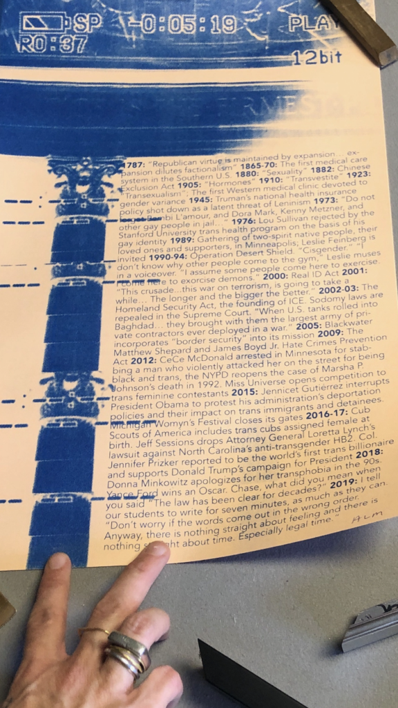 You end this timeline with the statement, “There is nothing straight about feeling and there is nothing straight about time. Especially legal time.” I love that. These timelines offer a non-linear historiography to ground your project. And, they remind us that filmmaking is a practice that produces many things, not just films.