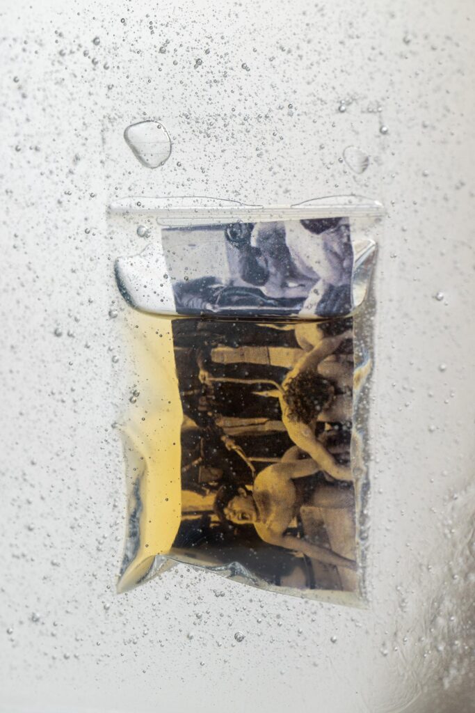 I’m really interested in the concept of preservation. I work with archives—legitimate queer archives—as well as archives of film where I’m just ripping stills from them. When I do, I’m thinking about what’s important to preserve or not preserve. In both of those methods you mentioned there’s an element of preservation, but it comes through destruction. With the appropriated photos covered in resin, there’s a level of destruction as the ink jet prints are soaking up this liquid resin, then those inks start to spill and leak, and when the resin becomes this solid plastic, it’s in theory preserved forever. With Markingit’s preserving those as well by photographing the already existing images, but then the destruction comes in the form of me and my partners pissing on them. In both cases destruction is being preserved.