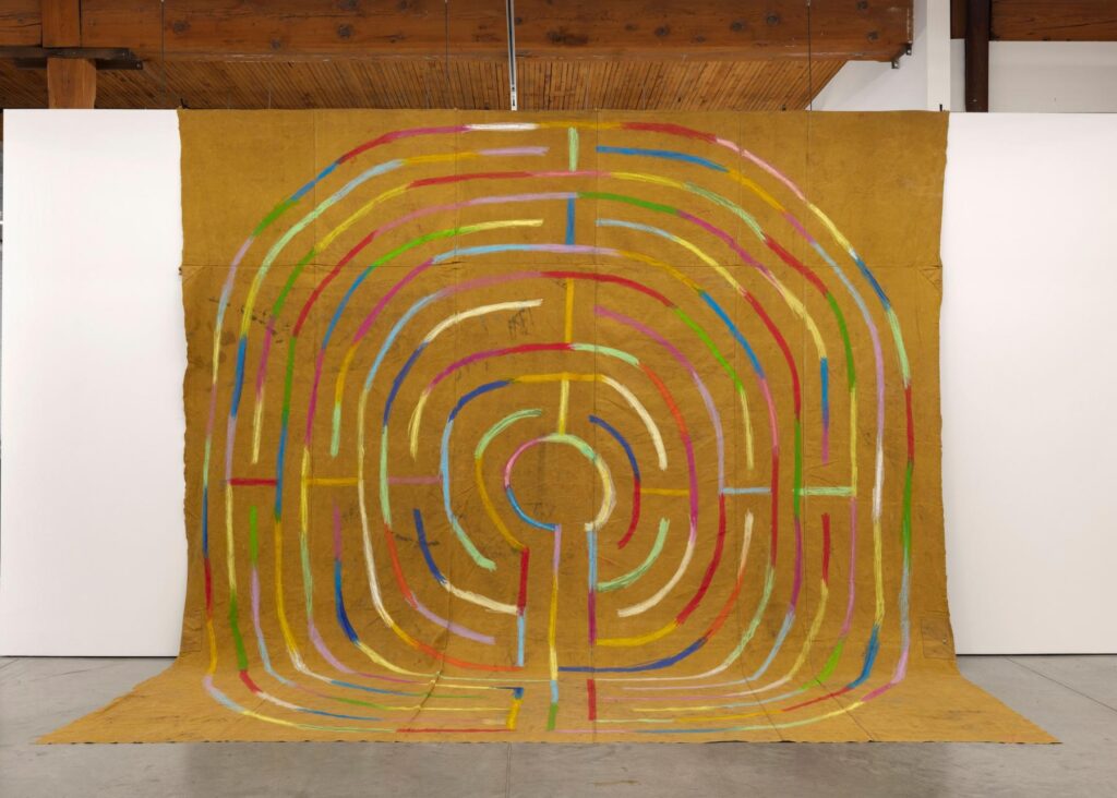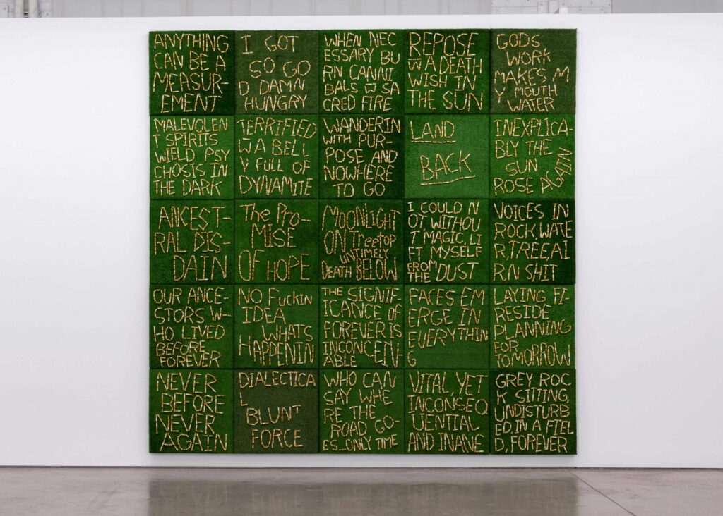 Split between the basement and the adjacent garage, where Tisiga has set up a home gym, the studio has a retro vibe. Faux wood panelling lines the walls. The floor is carpeted with pieces of green artificial turf—the same kind that appears in the artist’s aphorisms series, with text rendered in plaster cigarette butts; and in his large-scale installation An Exercise in Resilience, acquired by the National Gallery of Canada in 2017. The tables are cluttered with cut drawings for new collages and some blank canvases lean against the walls. As I try to roll a cart out of the way, Tisiga reaches over to help. “It’s full of old rabbit skin glue,” he laughs, apologizing for the stink. He’s been using it as a binding agent in recent works. “It smells like rotting corpse,” he jokes.