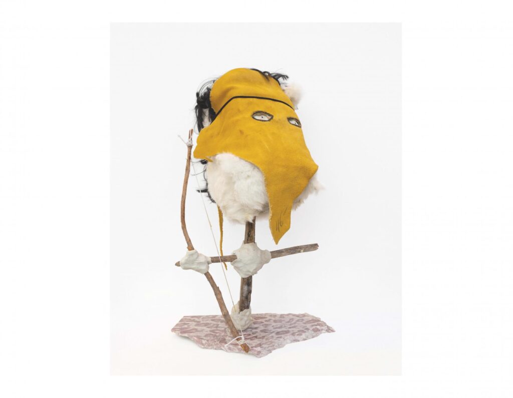 Tisiga, who turned forty last November, is known for his watercolours, oil paintings, collages, sculptures, and installations, though his earlier work also included performance and photography. A wide range of repurposed materials, both natural and synthetic, take their place in his art: wood, floor-waxer pads, animal fur and claws, porcupine caribou hide, construction supplies, tent fabric, architectural plans, and more. According to the artist’s mother, Sally Tisiga, this inclination for recycled materials stems in part from his modest upbringing. In a phone conversation, she reflects on raising two sons as a single parent on limited means. One of the best things to happen to her sons, she suggests, was growing up with little and having to rely instead on imagination and play. “I think that’s the most important thing to say in terms of how Joseph was or how he would later be able to make something out of nothing,” she shares.