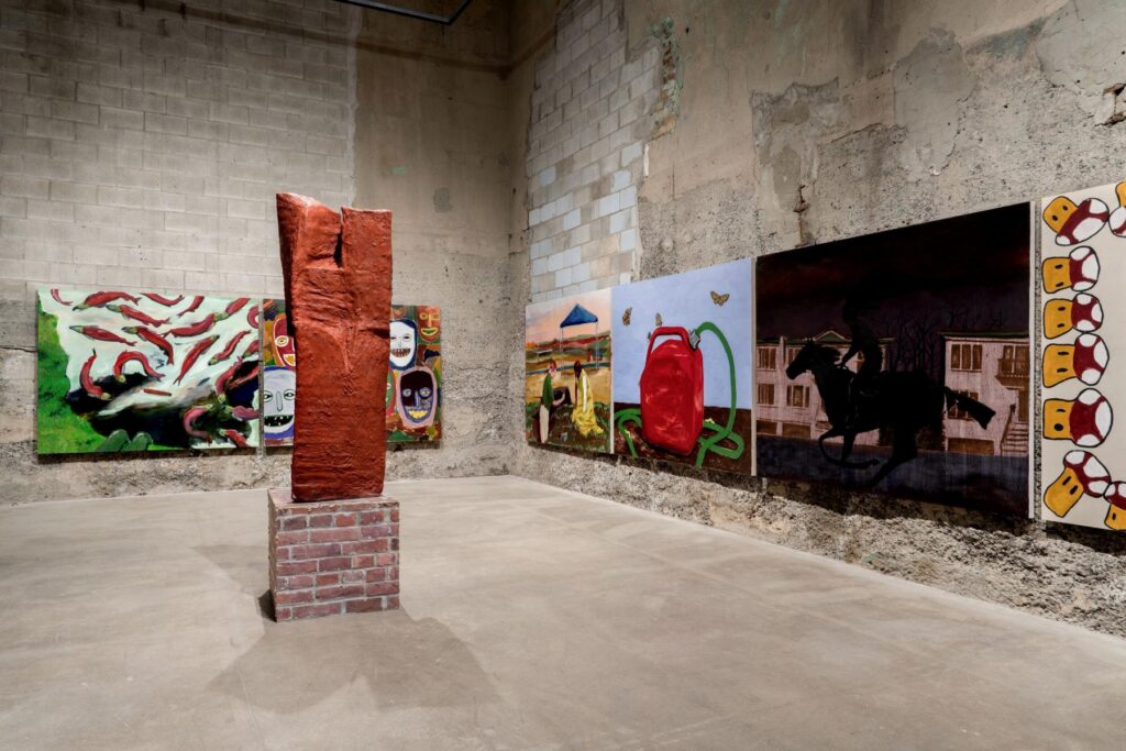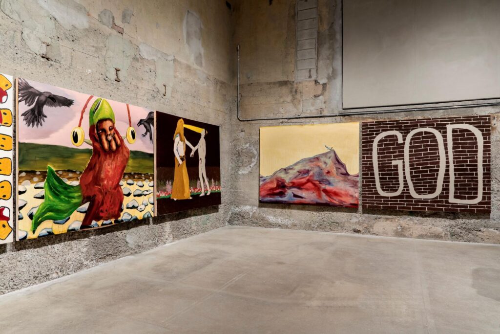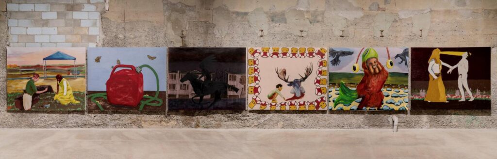At the bar, our conversation shifts to his latest solo exhibition at Bradley Ertaskiran, It Was God the Whole Time, in early 2024. He made ten large paintings for the show, which he conceived as a single narrative: they wrap around the gallery’s bunker space and unfold like still images along a reel of film. When an idea comes to him, he explains, he usually visualizes it like a movie. These recent works contrast somewhat with his earlier watercolours and paintings, which he describes as “figurative scenarios” or “micro-performances” that condense multiple narratives into a single frame. “These new pieces have much less information individually,” Bradley explains. “His watercolours are so rich, with layers of activity on every surface, and these works are like blow-ups of just one small part. It’s really representative of the way Joseph thinks.”