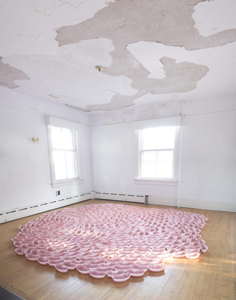Let’s talk about a recent example, Untitled (400 bedpans) (2020), which is a site-specific installation you did at the NADA House Governors Island Studio Residency, NYC, in 2020. The work consists of 400 kidney basins placed together to form a circle that suggests a spiral pattern.