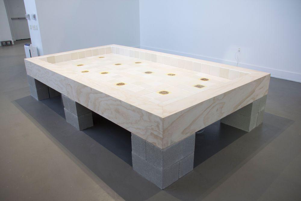 Where Yi compromises the grid through leakage, Cathy Lu undermines the grid through tactility. The California-based artist hand-pressed porcelain tiles in shades of off-white, tan, and yellow to form the basin of Drains (2022), a shallow sink-like installation. Subtle indentations in the glazed squares recall the embodied process of sculpting, indexing the labor of the artist and her assistants. The receptacle includes twelve painted porcelain drains modeled after ornate covers that Lu found while visiting Jingdaezhen, the famed Chinese ceramics hub. Through these decorative drains—which contrast the norm in the United States, where austerity reigns and grates are typically designed to disappear—Lu underscores the cultural and historical contingency of the design of sanitaryware.6