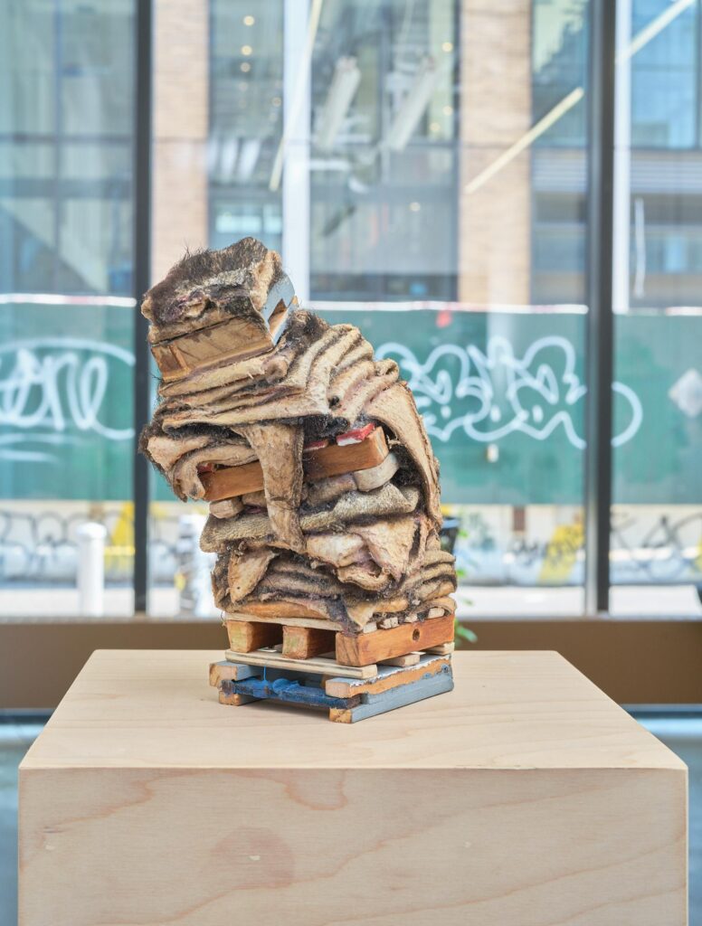 By invoking the interplay between growth and decay across species, Lin challenges modernist constructs of waste as “an unwanted surplus that needs to be contained by a variety of technologies and practices of ordering, management, separation, secretion or social categorisation.”2 Resisting such logics of control, Memory queers anthropocentric notions of use by mobilizing excremental fluids toward fungal growth—toward interspecies care. Artists Sophie Friedman-Pappas and TJ Shin likewise emphasize the contingency of “waste” by recalling longstanding applications of urine across cultures for centuries. Friedman-Pappas invokes tanning methods incorporating urine as a preservative to stabilize animal hides. In Salted Hide Pile (2021), the chemical alliance between human effluent and animal detritus foregrounds the cyclicality of all matter, denying linear capitalist logics of disposability. Shin meanwhile recalls dyeing techniques by utilizing urine as a mordant to enact crystalline forms on Petri dish-like ceramic plates in Astrological Botany (Artemisian & Quinine) (2023). Such legacies of urine in the production of indigo textiles—along with other colonial commodities like gunpowder and porcelain—evokes the material entanglement of bodies and bodily matter within imperial networks.
