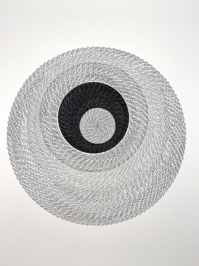 My interest lies in finding my center and having a dialogue with myself, in essence, dialogue with my creator, who also resides in me. This condition is a hallmark of today’s contemporary art-making, and I find it illuminating. This is why I do not claim that my performance is a Sama movement of a whirling dervish nor the resulting drawing is a mandala. It is a contemporary performance with its own language, hidden meaning, and unknown potential—potential that sprouts from a center and grows towards an undefined margin, which I believe is the edge of something new. This act of making and experience is unique to me.