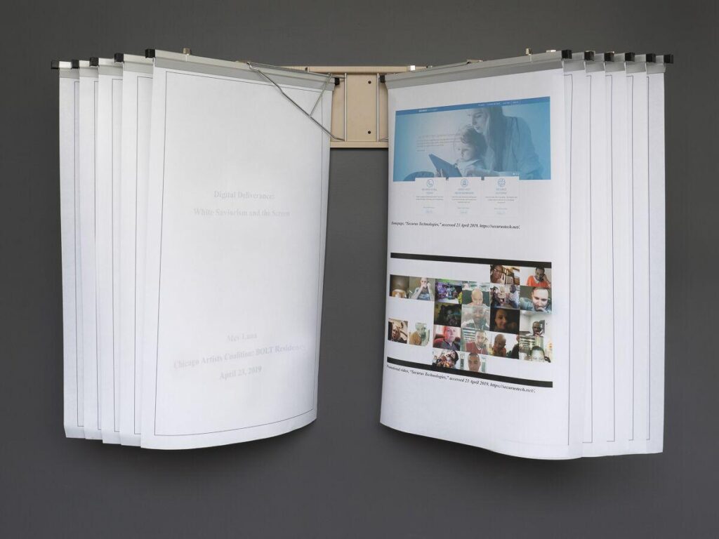 Digital Deliverance: White Saviorism and the Screen. Large format experimental publication, architectural blue print hanger, 2′ x 44,” 2019. Photo documentation: Jesse Meredith.