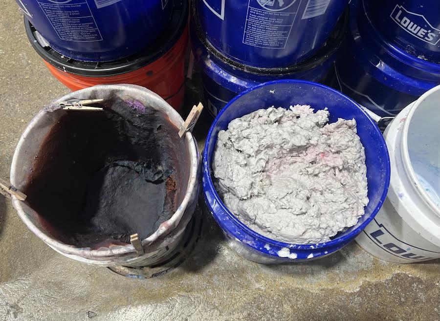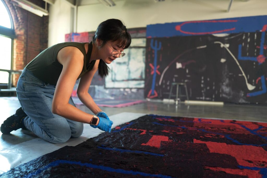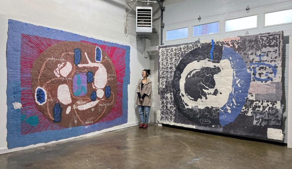 Hong’s studio, in Beverly, Massachusetts, revealed her methodical yet open process to the divine all around us. What caught my attention immediately were notations on paper with book quotes, journal entries, and maps onto plastic tarps made by the artist with Mandarin written in Sharpie. Those ideas are crucial in each step of the process as it guides as scripture does for life. The paper she pours, in her studio, was in its infancy, a mixture of blue construction pulp that she will one day, pour 12 ft × 8 ft (3.66 m × 2.44 m) — the largest pour she creates without losing her balance. Once she finds a place to set the pulp, she lets the atmosphere dry the paper.