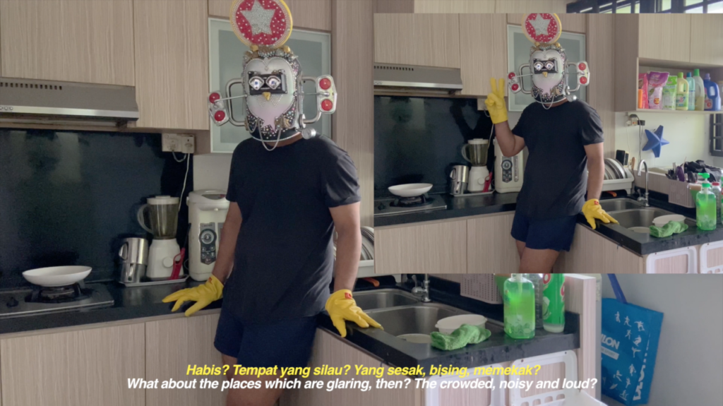 The film’s sound was constructed in collaboration with my comrade berukera.8 Aside from the monologue, we wanted the sonic elements of the film to emulate the various personalities in the neighbourhood, so we settled on a combination of ’90s Bollywood soundtracks, Dangdut hybrid beats, siren and alarm calls, and flamboyant techno. My monologue (read in my mother tongue Bahasa Melayu), paired with the disparate sounds collected by berukera, complicates the legibility of the film’s aural experience.9 There were also instances where I deliberately used colloquial languages such as emoticons of, for example, eyes, an eagle, an eggplant, and sparkles. This mode of communication is alien to my mother who reads predominantly in her mother tongue and speaks very limited broken English. This trans-languaging approach, interwoven with the unruly shifts in visuals, emoticons, sound, and subtitles as a whole mimics acts of flocking, congregating, bedazzling, and cluttering, as observed in the behaviour of pigeons.