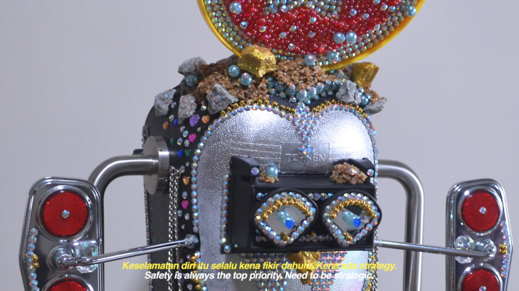 Shapeshifter(s) is the title of my first film.1 I shot it using my iPhone 11 in my neighbourhood of Boon Lay in Singapore. I’ve always wanted to make a film—not a big one like those screened in the cinemas, but modest, just for me to make sense of the recent pivot in my practice. In hindsight, I feel this shift from working with objects and sculptures to recording footage and the voice only intensified my desire to resist defining what I make based on the medium I use. Instead, it helped me focus on finding meaningful ways to echo the veiled lived experiences of my community—who are misrepresented by the mainstream media—through a more mindful approach which is itself coded and opaque. In the film, flora, fauna, objects, and sites take on surprising roles with multiple shaded layers—the pigeon an undesirable protagonist, the light an exuberant antagonist, and everything else in between. In the work, feral pigeons are portrayed as stunning birds up until the point when they become a nuisance because of how we see them and the spaces we reluctantly share with them.2 These birds also appear in the form of masks, a relic from my earlier series of works titled pigeon (people like us).3 I used a welding mask—an object used to protect one’s eyes, face, and neck from flash burns, ultraviolet and infrared light, sparks, and heated objects—as the base for the pigeon masks. This gear was sourced from a workers’ supply shop in Boon Lay, and I embellished them with rhinestones so that they would appear fabulous, especially in the shade.4 Up close, other elements on the masks reveal themselves to be objects that enable safety—road reflectors, blindspot mirrors, and handrails. I was drawn to the ways in which light can be subverted and used strategically in disadvantaged communities: repelling, shielding, and diverting instead of disclosing. The extravagant appearances of these masks offer a kind of opacity by acting as an unassuming decoy. You are less likely to see a person who wants to remain hidden, all you see is a bedazzled mask. This is crucial for the survival of marginalized folks because visibility for us could invite unwanted attention and violence.
