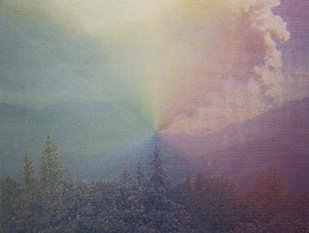 When I was thinking about Sfumato and Piero di Cosimo’s Forest Fire, I was sure that I somehow needed to include a painter. I was doing research on contemporary landscape painting and I encountered Dan’s Colorado Series, which was created after he contacted another person named Dan Hays, an amateur photographer, and asked if he could use his landscape photographs as source material. So, like the paintings he did for my film, they also have digital artifacts as their origin, interpreted through brushstroke. This was at the same time that I was coming to some conclusions about medium specificity in my own work, like shooting on film; and how I really wanted to engage this question about the digital image, about reliability, and the relationship between the two. When I saw the Colorado Series, I thought it was a really great encapsulation of some of these ways of working.