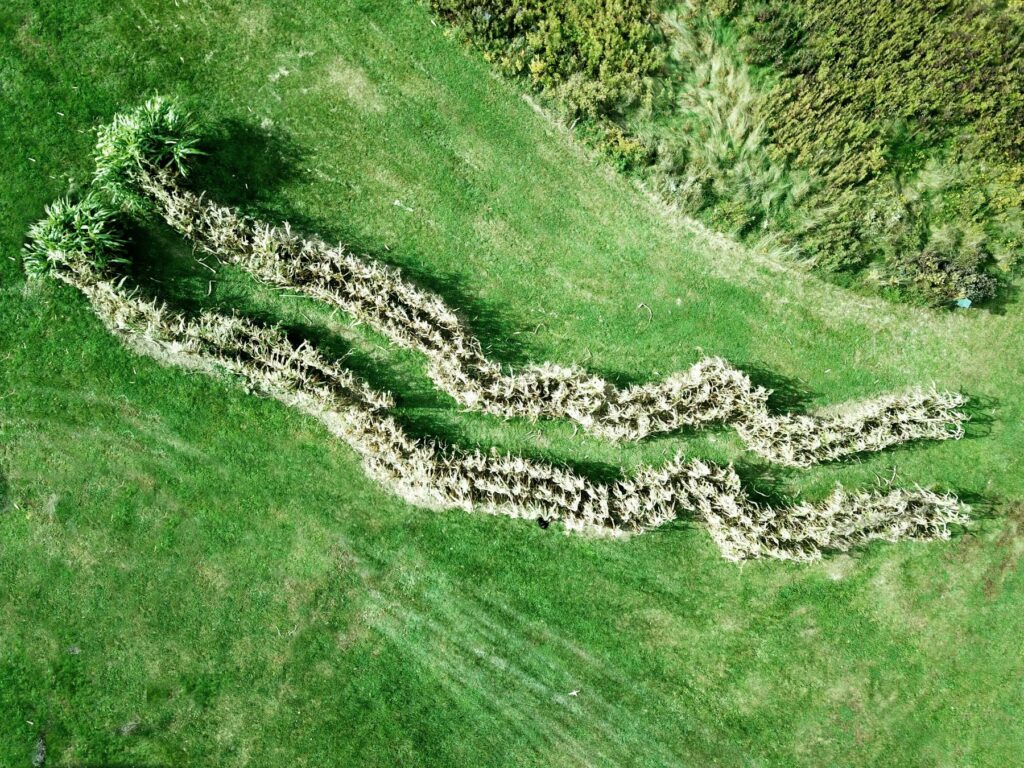 With Naturalized Borders, we planted corn, squash, and beans—the three sisters—in the shape of the U.S.-Mexican border line. It was an eight-month project that was commissioned by the Live Arts Biennial of The Fisher Center for the Performing Arts at Bard College. Curated by Gideon Lester and Tania El Khoury in 2018, it was called Where No Walls Remain. This was a land art piece of a hundred-foot-long plantings of this line, and a physical space that references the line of the abstracted border.