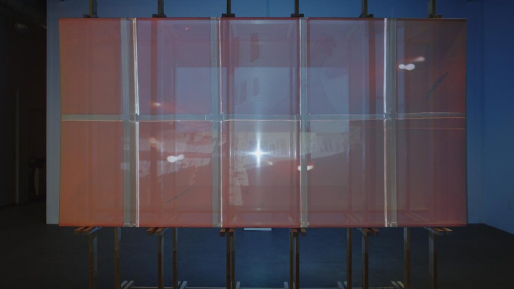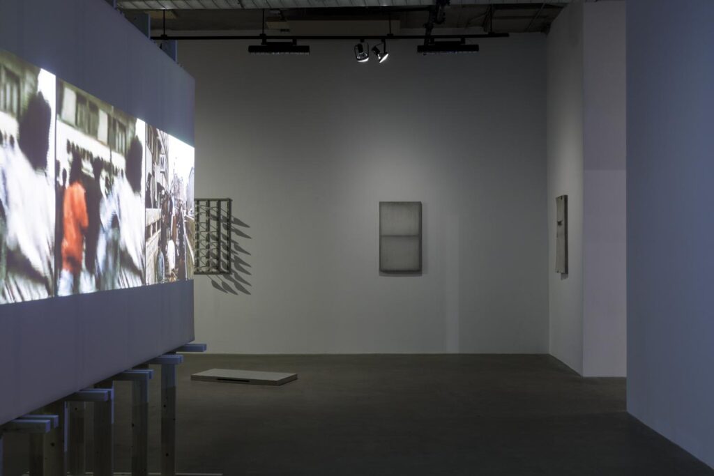 At the center of moraru’s exhibition is an architectural structure, a precise wooden frame of posts and beams onto which she projects a film: fragments, glimpses like memory, a blurred vision seen in double. Crystal cut glasses, empty church pews, a crowd, a railway; all reflected and refracted (watching these fragments flicker, I’m reminded of Boris Smelov’s Still Lives, of lead glass and dark wood reflected in silvery mirrors). Between the projections there is an empty space, a gap in the frame, a place for the body—or a place where Ana might stand devoutly as the stones pile up around her—and on the walls, corrugated plastic sheets evoke the dirty windows of abandoned structures, or the construction tarps that shroud the scaffolds of worksites. A metal truss holds up a wing of plastic toe caps, their shadows like Manole’s ghost. With poetic intuition, moraru’s work sets the stage for the ballad, all the pieces squarely in position. Watching the video, the static overlay glitching over scenes of an overgrown construction, moraru invites us to ask: what are those wielding ideology or power willing to sacrifice in order to cement their own creations? What cosmogonic myth is anchored into a spire, a vault, a pediment or a dome? What fantasies do we project onto the architecture that surrounds us? And what fantasies does the architecture project back?