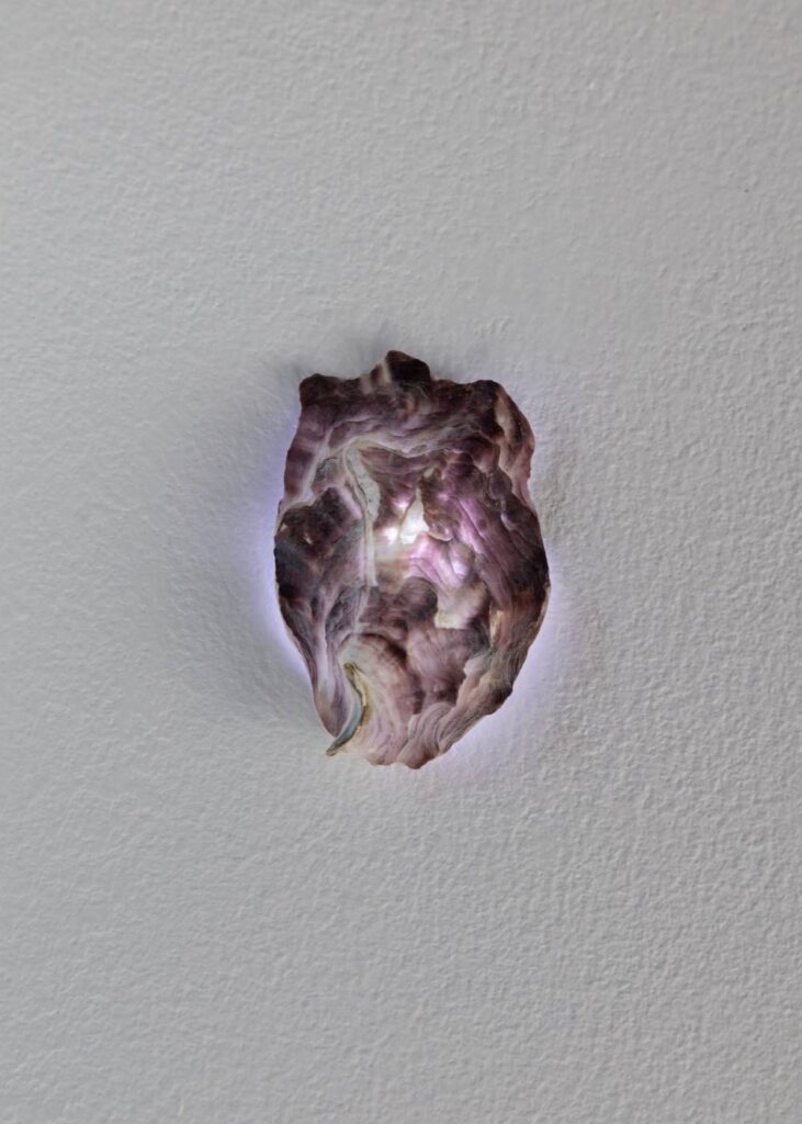 The view is total sea comes together in a clean, sparing use of sculpture, painting, and lens-based media works. An oyster shell on the gallery’s outer wall greets the passerby with a diffused, electromagnetic glow. In through Joys’ arched entryway, a rounded metal faucet drips a single plastic water droplet. On the three surrounding walls hang the exhibit’s two-dimensional works: a photograph of a sandcastle in its architectural prime, an oil painting of grass in deep shades of green, and a photograph of a soda can, the image set beneath a layer of glass straws. Towards the back wall of the space, a series of pebbles in a cylindrical resin casing are camouflaged where they lie on the cement of the gallery’s floor. From behind the arched doorway on the gallery’s back wall come the rhythmic sounds of wind and waves. They emanate from a single-channel video of found ocean footage with narrative captioning. A polymer clay rose thorn of less than an inch juts out from beside this door frame, around knee-height. The cool metal of the Bauhaus-style faucet and the rounded glass silhouettes of the reusable straws are in clever conflation with the organic contour of the oyster shell and baroque river-stones. The work grinds the roughness of the organic world into something of a picture.
