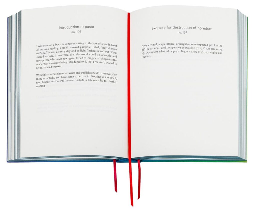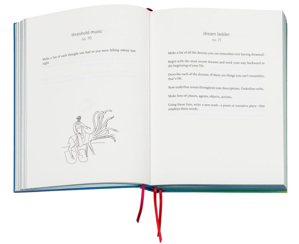 The book I’m holding is sturdy like a rock but appears as vibrant gradation, like a spear of light in a prism or the memory of a peacock in flight. I thumb open the tome guided by one of three ribbons, each a different shade of red, to mark the start of something, or my eager return. Inside I find lines of instruction, but also many other kinds of lines, some that provide directions (“Journey inward toward new exteriors”) or pose questions (“What are the heroics of a lack of heroic qualities?”). Still others simply stretch open the mind.