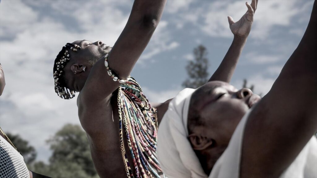 Emerging from the bushes and walking towards the shore in an unspoken tempo is a group of adorned African descendants. Amidst hand holding gestures, they form a harmonic circle in a stance typical of a prayerlike formation with their head touching. Subsequently opening in chorused and abstract bodily movements, they softly ascend merging with the elemental weather amidst melodious music rushing like water. Such a rapturous rescue fused towards a vanishing point.