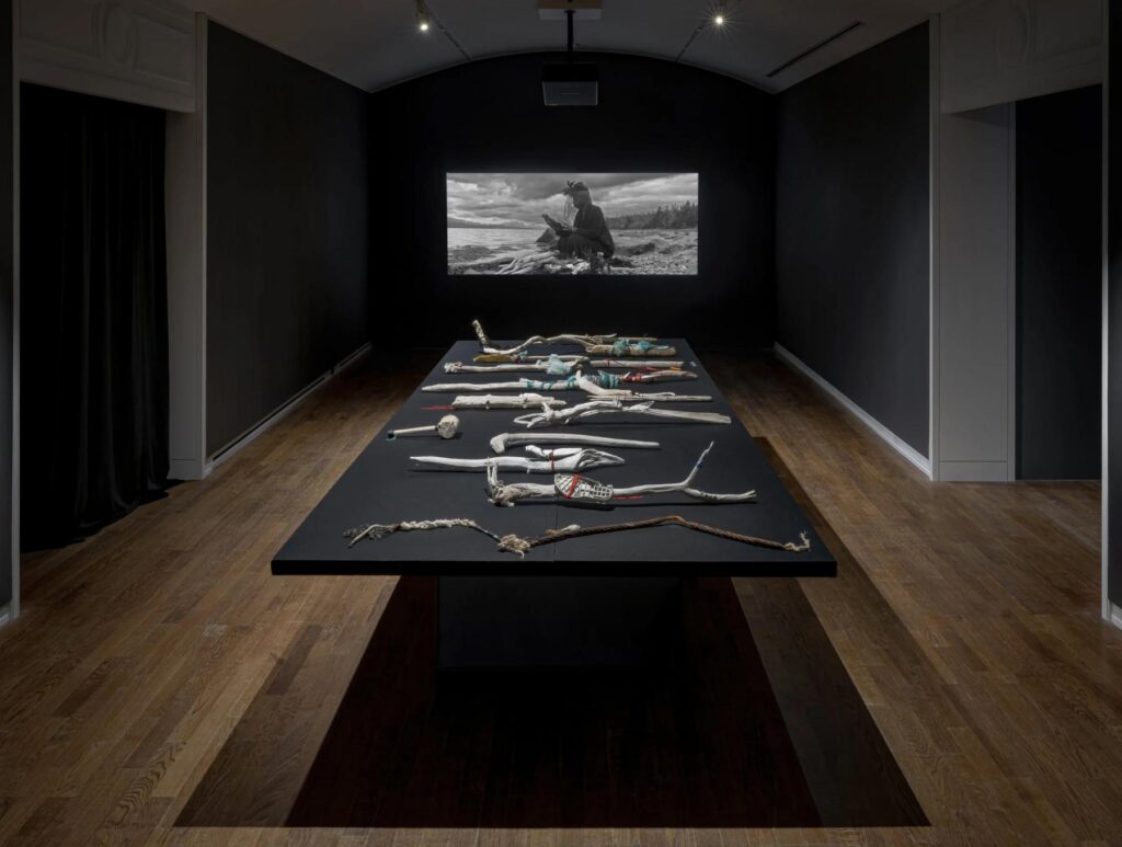 Yet another room in Camille Turner’s mazelike exhibition houses a three-channel video titled Nave (2022) spreading across the length of a wall. This installation suggests the complicity of Euro-Christian faith in the transatlantic slave trade—drawing parallels between the nave of a church in the Canadian Maritimes both to the coplanar likeness of a slave ship’s hold, as well as the concrete or formal configuration of the hull of a ship when inversed. The artist features here as a time traveller from the future who visits a religious edifice in our present ‘Age of Silence’ to perform a ritual in remembrance of ancestors who lived during and through the Middle Passage. The artist, dressed more shamanic than sacramental, holds onto a mantle that bears resemblance to one of the compound /complex bio-sceptres found in Sticks and Bones.