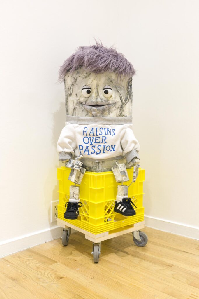 One of the first things I did when the pandemic started last winter was make a sweatshirt for Marble that reads “Raisins Over Passion.” As we speak right now, that’s what she’s wearing and a pair of infant-size Adidas superstars that I bought at an outlet store. They fit Marble perfectly, as do an infant-sized pair of white socks. While this gives me such huge pleasure, imbuing Marble with something akin to life really, I have moments of wondering if it’s too much. Too kitsch? Too consumable? But what I’m trying to do more and more is to trust myself. Trusting that I have been doing this long enough, and that, not always, but often, my impulses will be good ones. I’m trying not to be too precious about things, but that doesn’t mean I don’t care as much about my desire to communicate—it means I’m trying to just fucking trust myself. Marble the puppet has been a big lesson in trust—in trusting this puppet and the impulse to make the puppet and have her continued presence in my work with her sharp tiny kicks on.