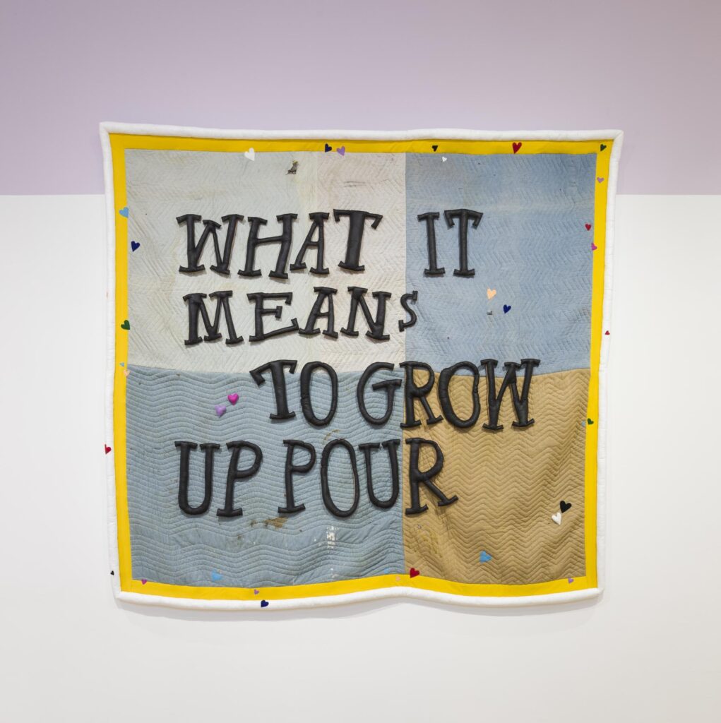 Words are sharp, even though the ones in what became the What It Means To Grow Up Pour banner are soft, stuffed and possibly familiar in their hand-written scrawl. What It Means To Grow Up Pour tracks a whole lot of liquid into a kind of provocation, or a statement that is more of a path than an answer.